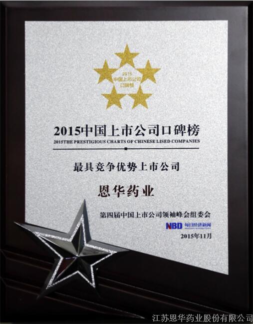 我公司被评为“最具竞争优势上市公司” 2015-11-30 Font Size 2015年11月,我公司被“第四届中国上市公司领袖峰会”组委会评定为:2015中国上市公司口碑榜“最具竞争优势上市公司”。公司主要生产经营中枢神经系统用药,战略定位于中枢神经药物领域市场。